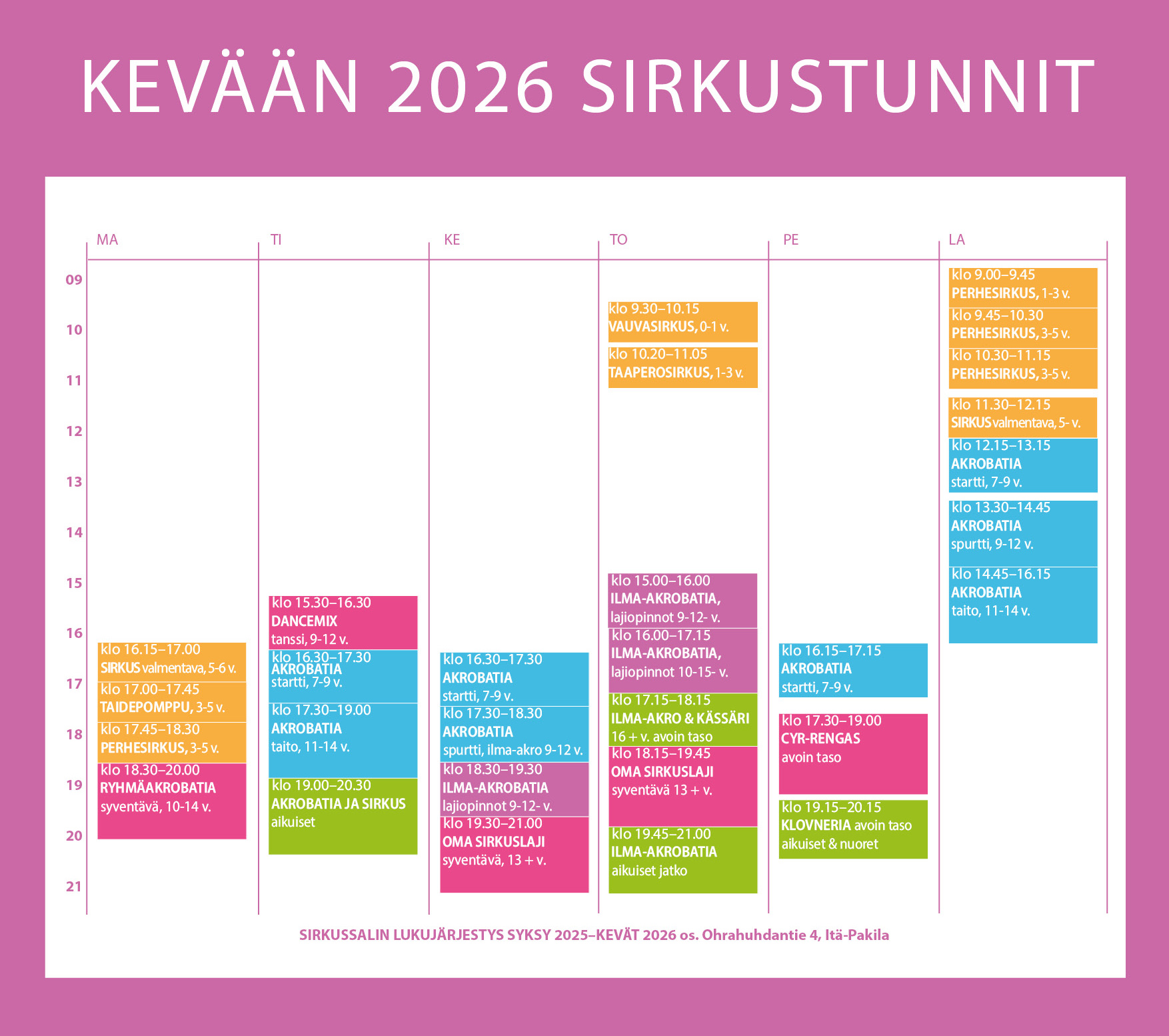 Katso sirkuksen lukujärjestys alta. Ajantasainen tieto ryhmien ajankohdista näkyy Eepoksen ilmoittautumislomakkeilla.