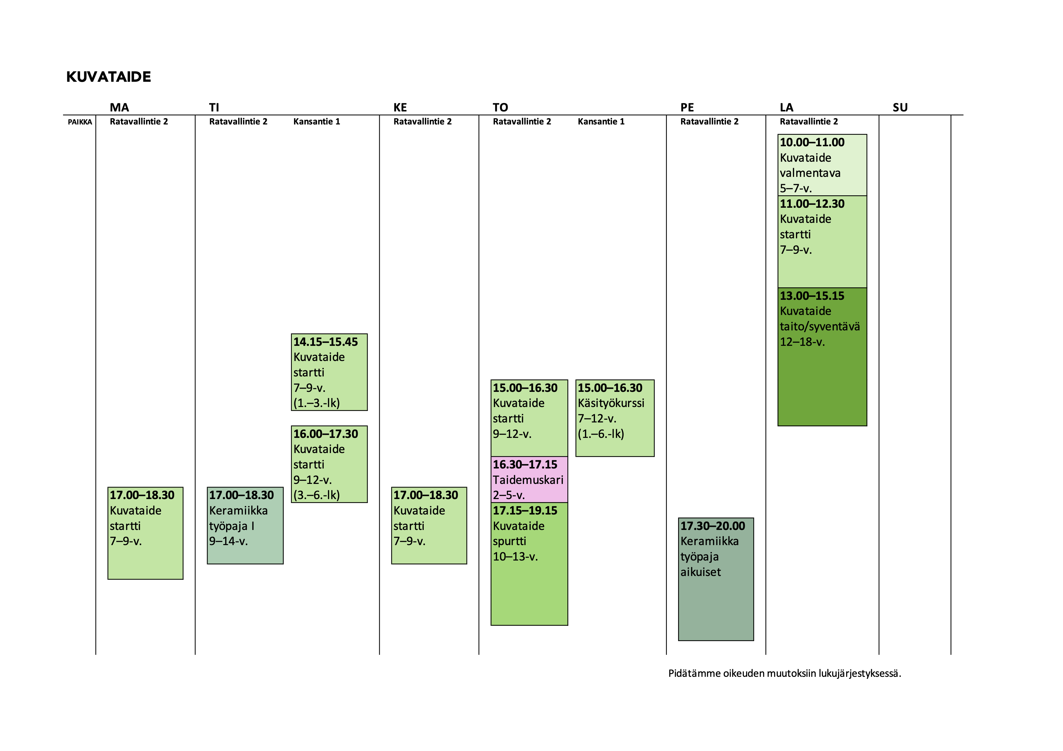 Katso kuvataiteen lukujärjestys alta. Ajantasainen tieto ryhmien ajankohdista näkyy Eepoksen ilmoittautumislomakkeilla.