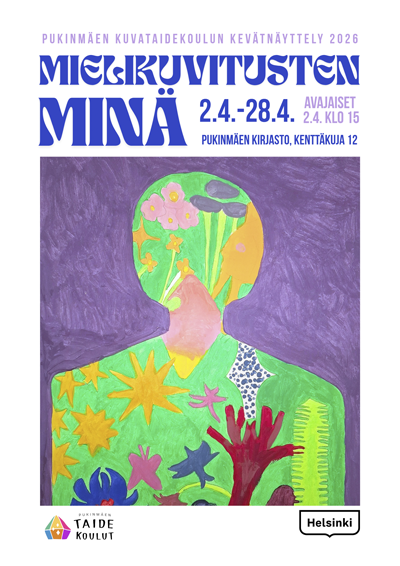 Pukinmäen kuvataidekoulun oppilaiden kevätnäyttely Mielikuvitusten Minä Pukinmäen kirjastolla 2.–28.4.2026. Näyttelyn avajaiset 2.4. kello 15.00. Vapaa pääsy. Tervetuloa!