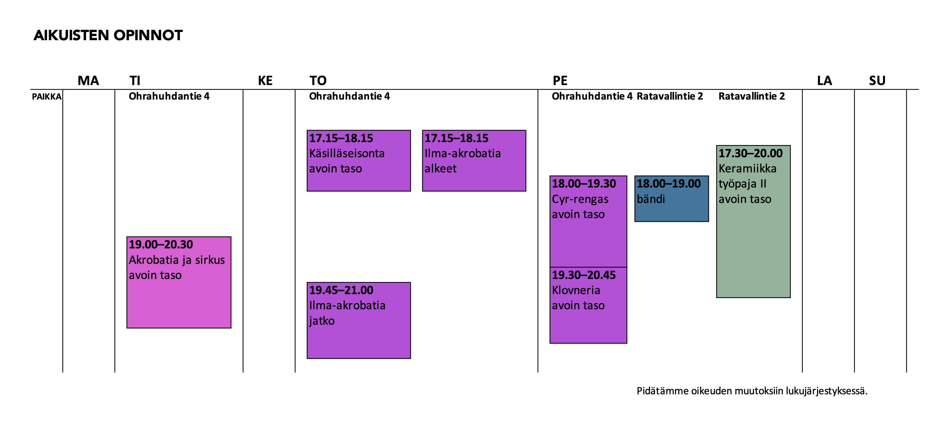 Katso aikuisten opintojen lukujärjestys alta. Ajantasainen tieto ryhmien ajankohdista näkyy Eepoksen ilmoittautumislomakkeilla.