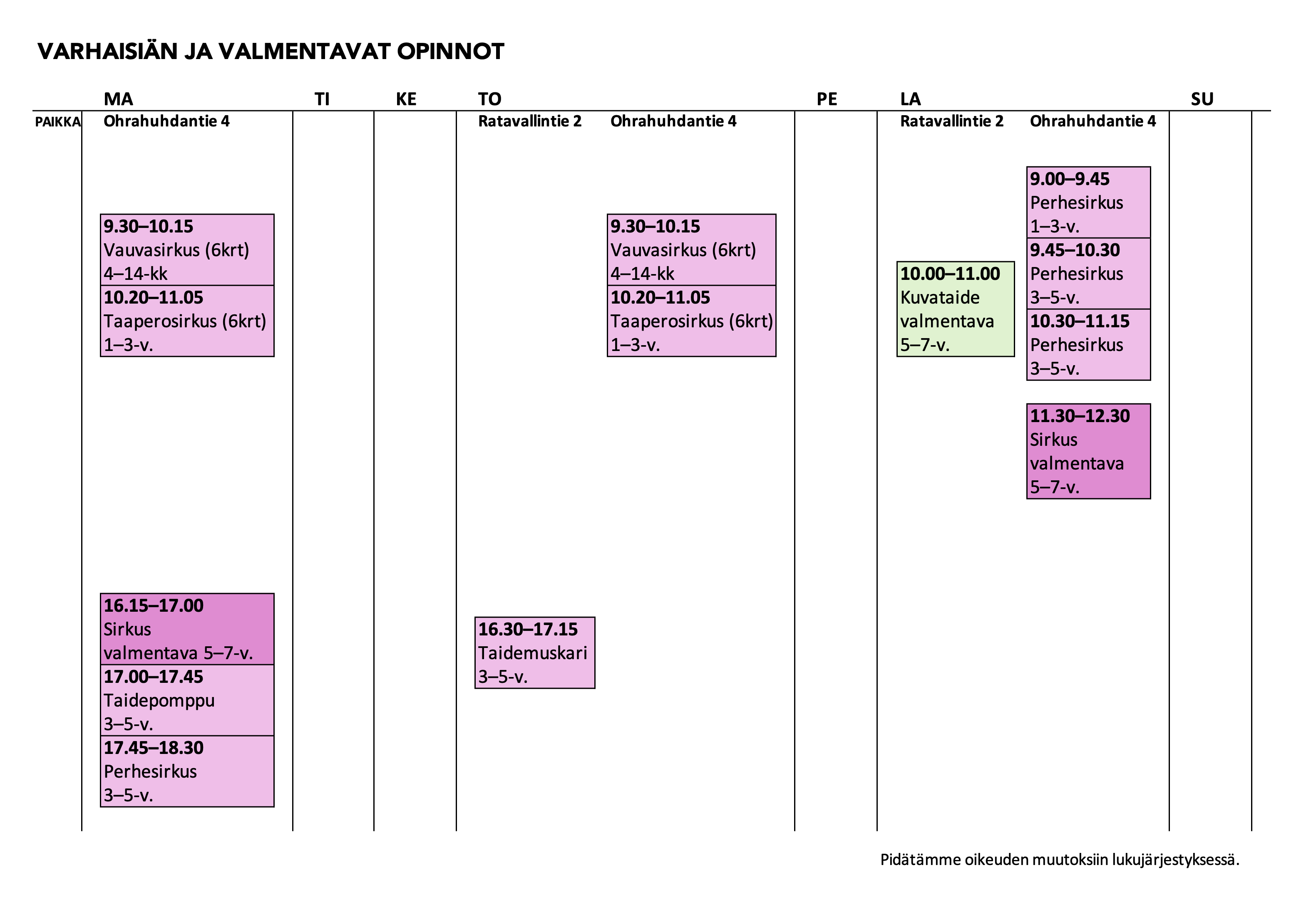 Katso varhaisiän ja valmentavien opintojen lukujärjestys alta. Ajantasainen tieto ryhmien ajankohdista näkyy Eepoksen ilmoittautumislomakkeilla.